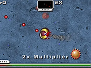 Steer with your mouse and fire with your space bar. Watch your ammo - if it gets low bump into the green orbs to get more. Shoot enough beasties and you get weapon upgrades.