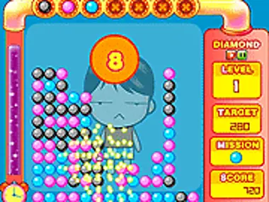 Click groups of 3 or more of the same-colored bubbles to make them disappear before the bar on the left gets to the bottom. Keep the stack as clear as possible, clearing as many bubbles at a time as possible, without letting it reach the top of the screen.