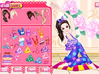 Dress up the yoga teacher as she instructs her students how to do good stretches and relaxing breathing techniques! Choose between a floral wallpaper or a big city skyline as a background for her yoga class!