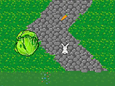 Bunny likes to eat carrots, but watch out for the cabbages! The cabbages are fighting back, and will squish Bunny if they can. Get the carrots to gain super powers, destroy obstacles, and avoid the tall grass which slows down Bunny.