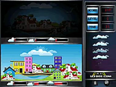 Regulate the climatic conditions of the towns by placing the needed cloud on the towns appropriately. To place the cloud on a town, take the cloud from the grid and place it on the appropriate town. Placing the Plain cloud on the town will freeze the other climatic conditions of the town for five seconds.If any of the climatic condition bars gets emptied, you will lose the game.