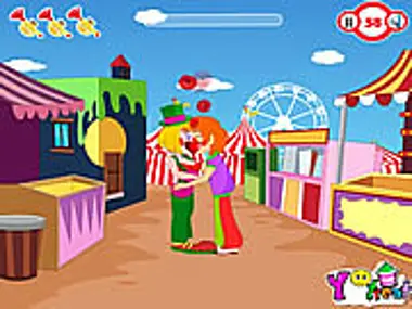 Stylistic makeup n outlandish costumes. Yes!! It is about Circus clowns. Help clown couple to kiss each without getting noticed.