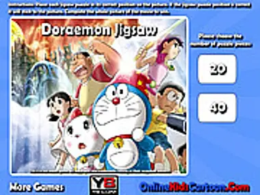 Complete the jigsaw picture of Doraemon and his friends from his show. There are two levels. Choose between a 20 piece puzzle game or a 40 piece puzzle game. Place each jigsaw puzzle in its correct position on the picture. If the jigsaw puzzle position is correct it will stick to the picture.
