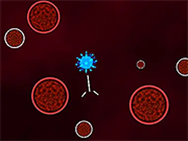 You are a virus and must eliminate all blood cells present. To eliminate a cell, you must absorb it. But be careful, you have to be bigger than her to absorb it. To move, you must give an impulse that will eject matter and cause you to lose mass. Take your time.