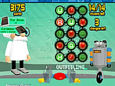 These robots are sick. They're full of letters or something. Mr. Vocabulary to the rescue! Make words using red letters to clean up your bots.