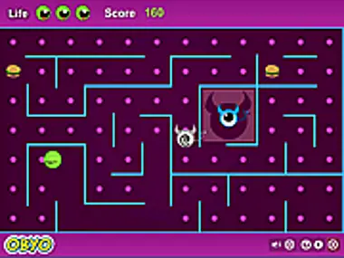 Eat all food pieces, avoiding devils. Eating burgers gives you extra power and scares the devils.