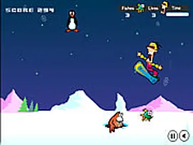 Avoid the penguins, bears, saber tooth tigers, snow mobiles and walruses. Catch 3 fish, then follow the flashing arrow to get to the next level. Pick up the igloos, coffee and evergreen trees for points and energy. If you don't re energize you lose a life.