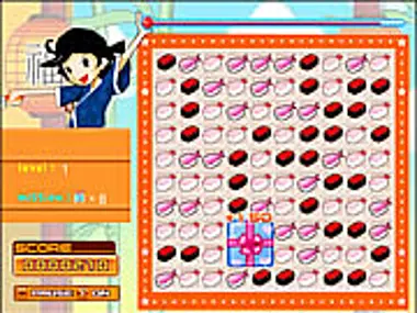 An addicting time-waster of gourmet sushi matching. Swap 2 adjacent sushi blocks to form a 2x2 square of the same kind; Flashing stars represent wild cards that can be taken as any sushi blocks.