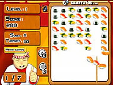 Gametator.com presents Sushi Stick, fun puzzle game for everyone. This is a match three puzzle game with unique gameplay. Click and hold mouse button to move the skewer. Match 3 or more same sushi to get combo. You can get special items by making a combo. Click the bottle icon to clear the skewer. Click the heart icon to clear first row.