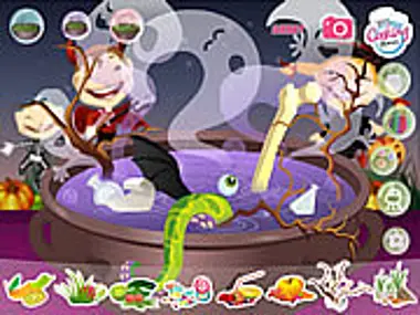 Candy, veggies and all sorts of scary fun cute critters are climbing in and out of this Witches cute cauldron. Help her brew up a deliciously magical concoction for her Halloween party!