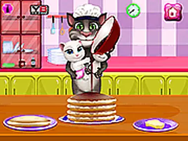 Tom was watching TV,there was a program how to prepare pancakes. Tom decide to prepare some for his kittens and he needs your help.Will you give him a hand? Before you could start, you need to get the ingredients first.You will find the ingredients in the kitchen cabinets and fridge, and take a look in the cook book to see the right order for mixing the ingredients.Then,start cooking the fluffy pancakes then decorate them with the most delicious fruits and toppings. Now Tom and his family are ready to enjoy your wonderful dish!Have fun!