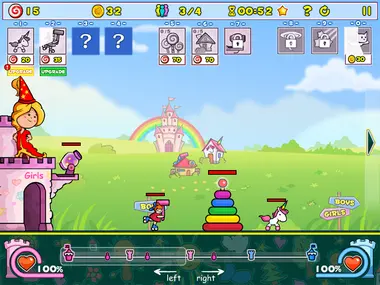 Pick a side, setup your troops, and fight against your mortal enemy! March from your castle to the enemy castle claiming ground in between. Destroy the enemy castle as soon as you can. Use really cool upgrades, air strikes, and many more deadly weapons to destroy the enemy. What side are you on, the boys or the girls?