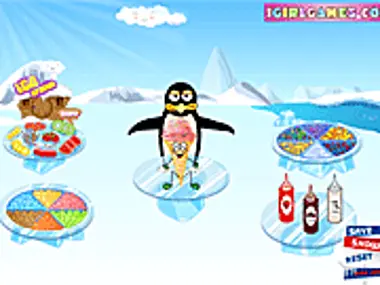 Help the little penguin to prepare delicious ice creams. Use the mouse to choose your favorite flavors. Then cover it with fruits, chocolate chips and syrup.